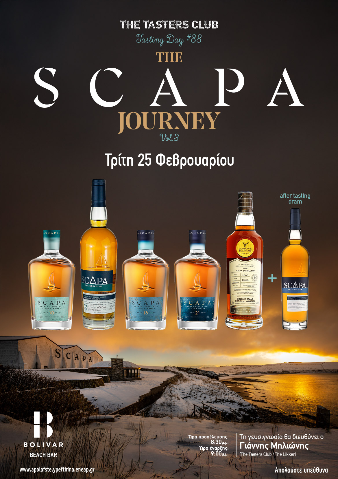Η Tasting Day #6 πίσω στο 2016, ήταν αφιερωμένη στο Scapa. Στην Tasting Day #42 το 2020 βρεθήκαμε online λόγω πανδημίας για να δοκιμάσουμε ξανά Scapa από τα σπίτια μας. Τώρα ήρθε η ώρα να επιστρέψουμε ξανά στα Orkney, με νέο lineup και τις ολοκαίνουργιες εμφιαλώσεις του αποστακτηρίου. Στην Tasting Day #88 συναντηθήκαμε παραλιακά, για να νοιώσουμε τη θαλασσινή αύρα που θα μας φέρει το Scapa στα ποτήρια μας!