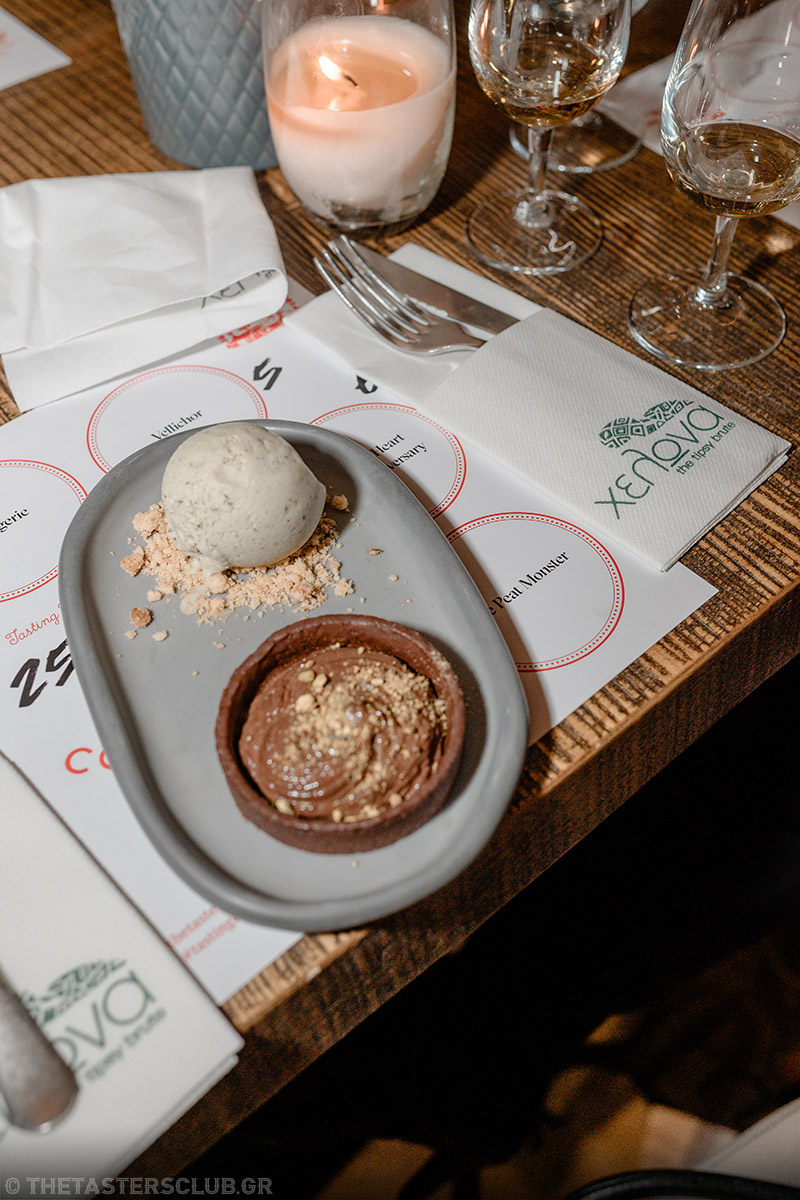 σοκολάτα bitter Valrhona, παγωτό φυστίκι, ελαιόλαδο, χοντρό αλάτι