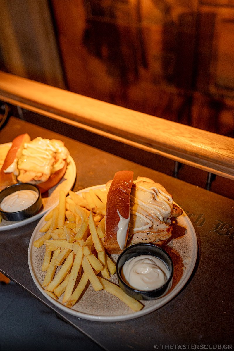 Φιλέτο κοτόπουλο, καπνιστό τυρί, μαγιονέζα, ντομάτα, iceberg, μαρμελάδα καπνιστής πίκλας, σε ψωμάκι lobster